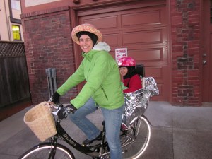 The MinUte isn’t the bike for everyone—I doubt you could fit two child seats on the deck—but we like it very much. I’m sure that it can carry less than a standard longtail, but it holds plenty for a small urban family, and it’s much more adaptable because it fits in small spaces like Matt’s cubicle. For new bikers like us, it’s been a nice entrée into cargo/family biking, precisely because it’s short enough that it’s possible to take it everywhere a normal bike could go. The thought of getting a big bike as our first bike was kind of scary. It is also easy to carry a kid (maybe two) and cargo without having to figure out how to add accessories like a trailer, another thing that felt kind of scary. And it is definitely a conversation starter, particularly with our son on board. Family biking is still enough of an oddity in San Francisco that even at events with valet bike parking, where it’s safe to say you’ll see a lot of bicycle diversity, people are always asking us about our bikes and where we got them. This bike was so much fun for Matt and our son that my daughter and I grew jealous. One day a couple weeks after they’d started riding, my son leaned over at dinner, patted my hand, and said, “It’s okay, mommy. You can get your own bike soon.”