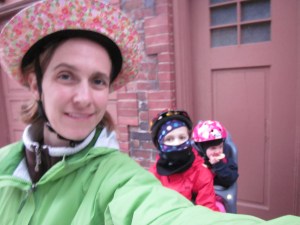 But for now, we have a bike that carries two kids (and then some) and it was her birthday, and she was already disappointed that Matt was out of town. So I packed up the bike the night before, and in the morning, loaded up both kids. Just getting to the street in the morning on such a long bike is an undertaking, particularly when Matt is away. By the time I got outside, I realized it was raining. Fortunately the kids were in multiple layers.