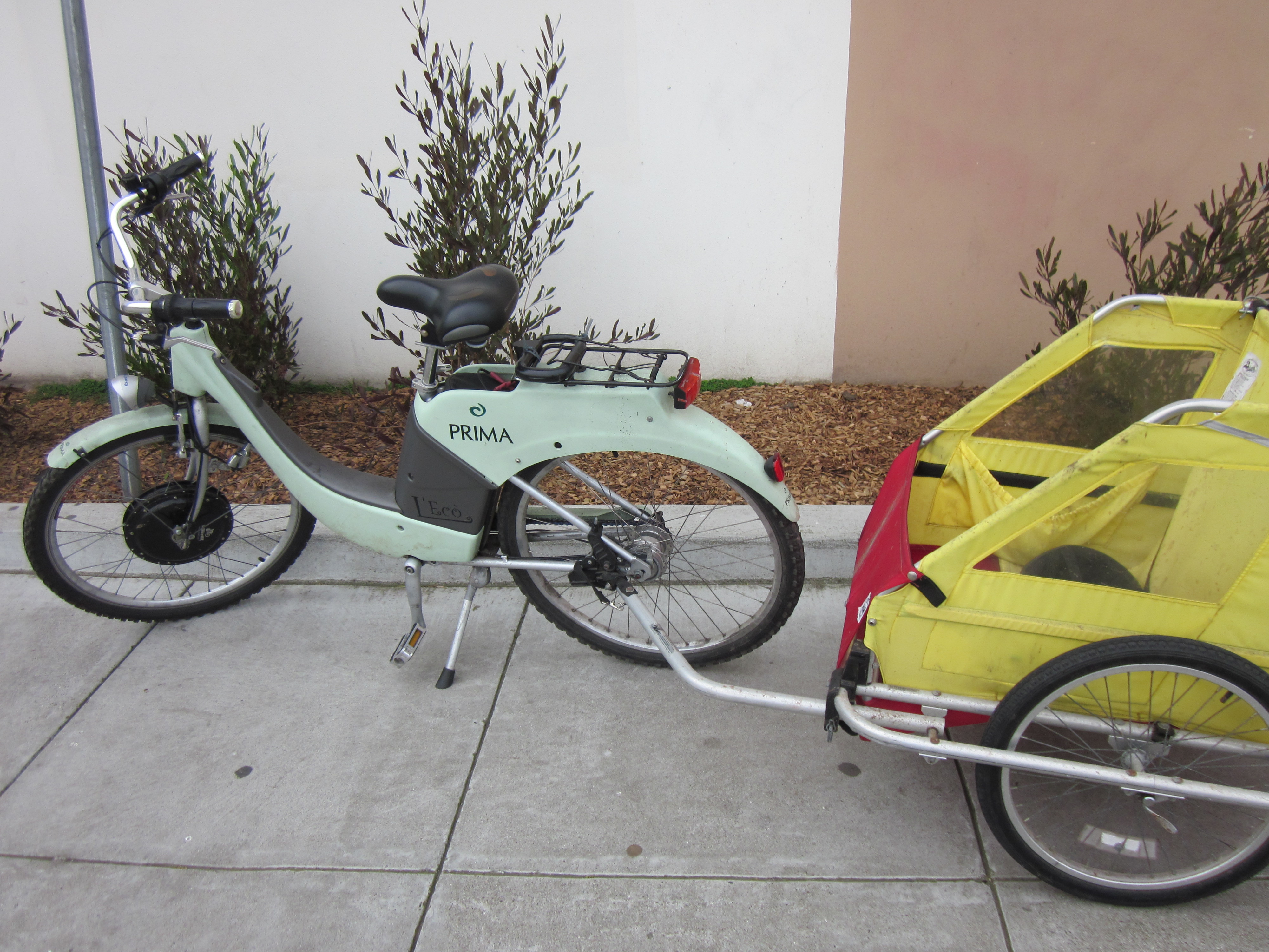 While I was getting lost on the way to Saturday’s class on getting kids on the road, I wandered through the park and library next door, and up to the middle school. There I saw an electric bike with a child trailer attached on the rear. Both of these are such rare sights that I immediately took a picture. Right after I did, the bike’s owner wandered out.