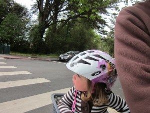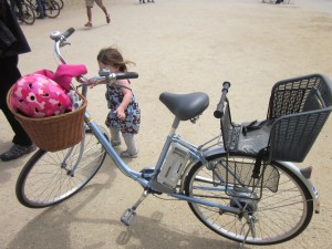 When I ride this bike people ask me where to buy it (craigslist, or barring that, Japan), or if they can buy it from me (no). It is easily the most coveted bike we own, at least in our demographic, and although the mamachari initially left our local bike shop unimpressed, they have been reassessing it in light of its popularity. My daughter begs to ride the mamachari at every opportunity. When we are on the streets she shouts to everyone she sees, “I’m riding a mamachari!!!” And then she turns to me and says, “Turn on the pink power, mommy. I want to go FAST!” And yet the mamachari is a bike that is so obviously only cool to parents that no bike thief would be interested in stealing it. Why is no one importing these bikes?!?