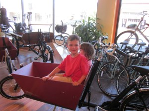 But that’s just me. Our kids get to live this way because it makes our lives easier, not because they chose it, although they were the inspiration. My kids are simpatico with our vegetarianism (which I realize is hopelessly retro of us in this brave new world of “primal” eating). I wondered if they would resist life without a car. We don’t spend much time talking about more general reasons we might want to reduce driving, as our daughter is three and our son worries way too much about doing the right thing already. We do our thing, and we told them we will rent a car whenever they want. And it turns out that’s fine with them. They like riding the bike and taking the bus and walking; it means we can pay more attention to them.