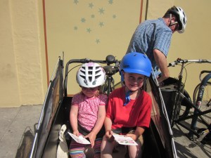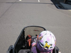 We have been in cars a lot in the last month: rides to the airport, rides to the train station, a week at my mom’s, a trip to Marin. We rented a car last week for one of our more intensive grocery runs, which involved refilling a gallon jug of olive oil and serious inroads into the bulk food bins. Altogether it’s worked to out about a dozen car days this month (although those were mostly clumped together while traveling, and astonishingly, all of them together still cost less than the lowest monthly tab of owning the minivan). This is apparently not enough driving to dislodge my kids’ new self-perception that riding a bike is what’s normal. On our trip to Marin, my daughter asked me whether it was possible to buy a car with electric assist that would make it go faster. I said that’s not really how electric cars work, and suggested that cars went fast enough already, but she remained unimpressed.