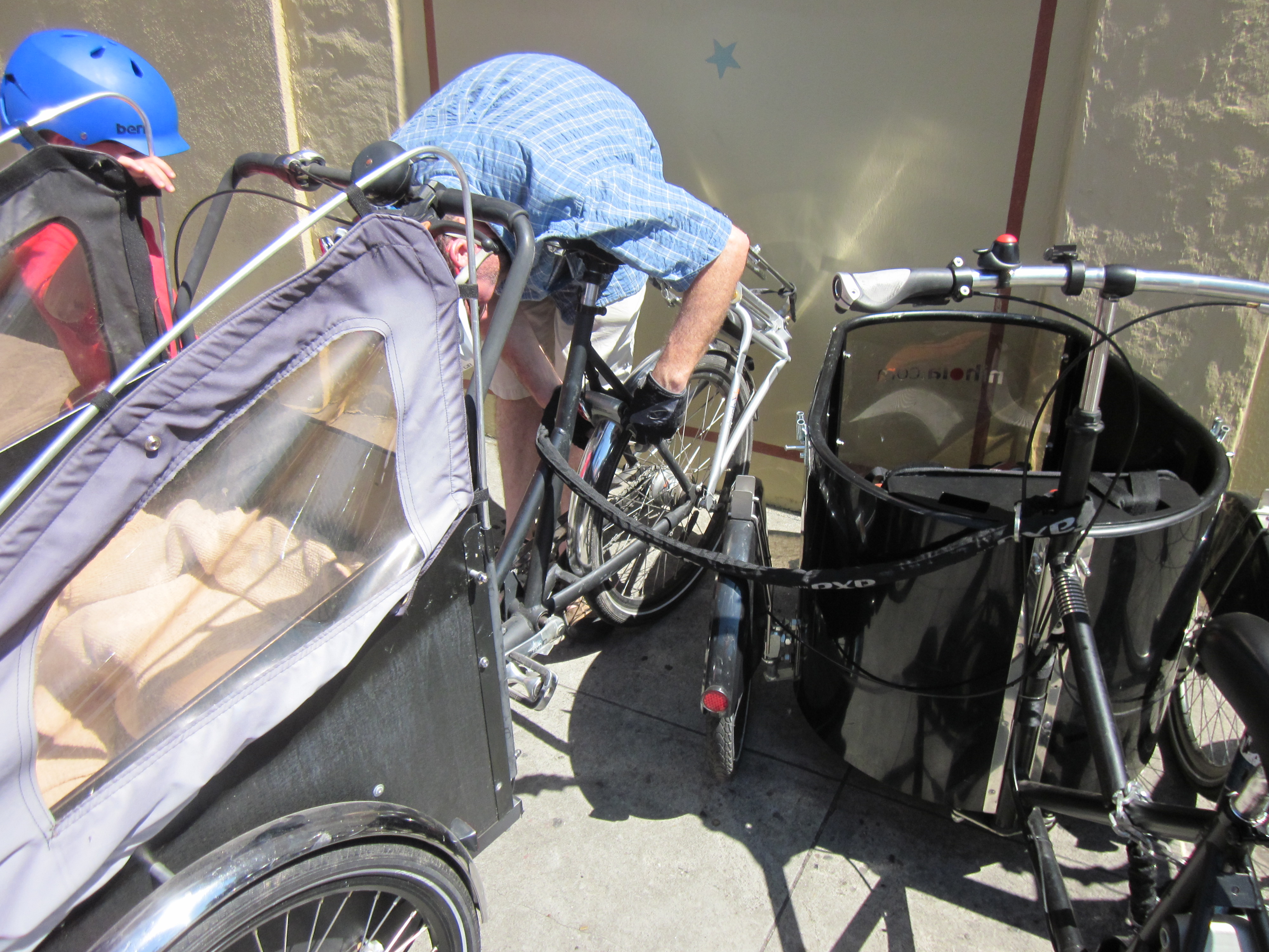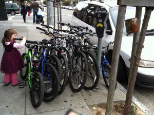 Although I’m not opposed to using a car occasionally, pretty obviously, not owning one has been liberating. When we drive I remember that being in a car kind of sucks: hello traffic, parking, and road rage. I definitely appreciate the increased range and time-savings over long distances (we won’t take BART to visit my in-laws again, it takes twice as long and is almost as expensive as renting a car), but altogether I’d rather be doing something else. My daughter’s preschool is closed this week, so on Monday we rode down to the Academy of Sciences, parked the bike at the (empty) rack by the front door, and walked right in. Watching other parents struggle out of their cars several blocks away or the subterranean parking lot, I thought, “I’m glad we’re not doing that anymore.”