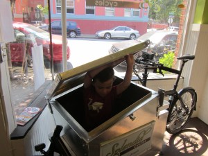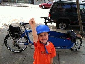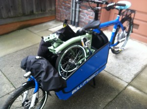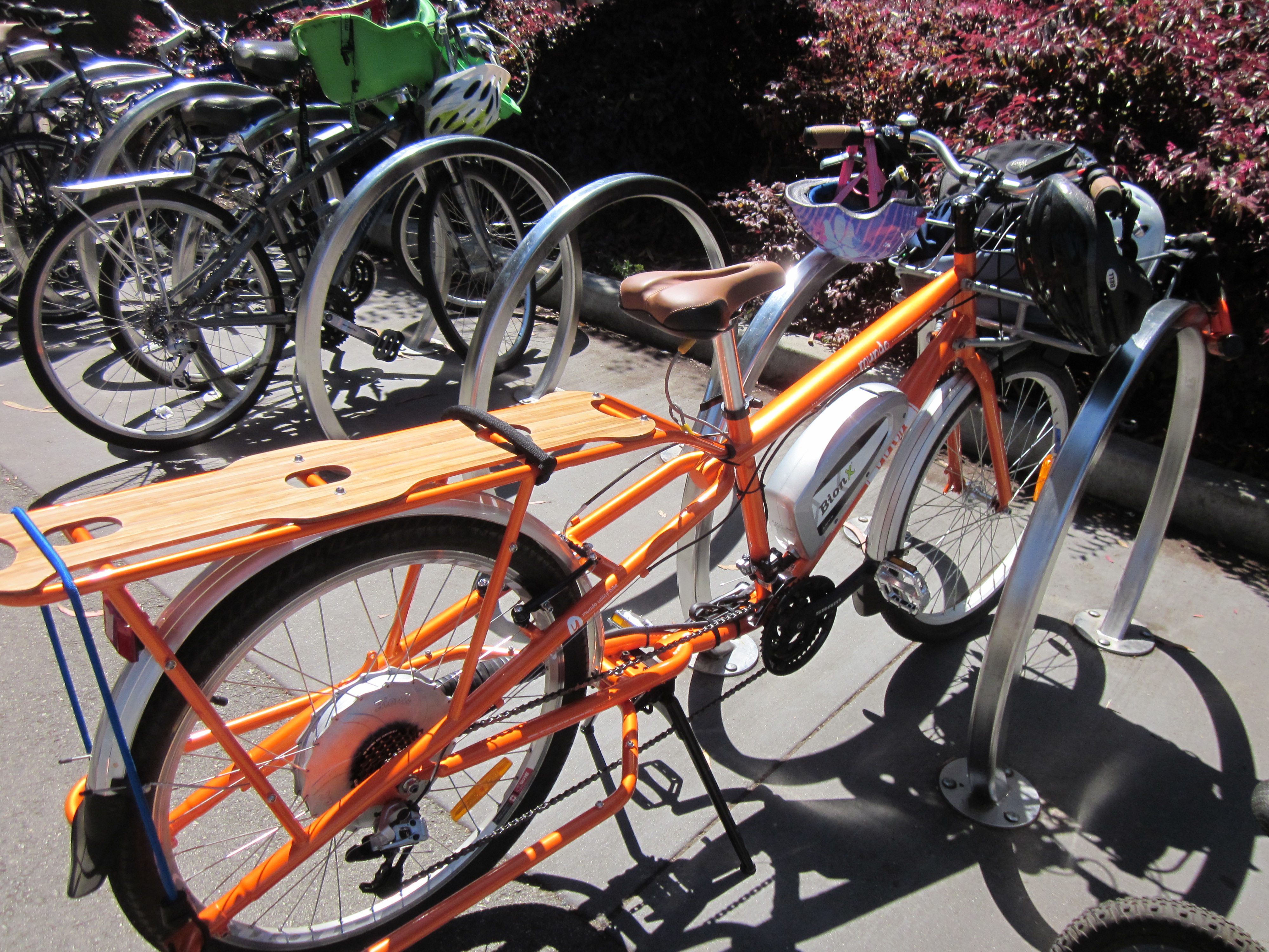 After riding all of these systems, the one that seemed best suited for our needs was the BionX (but how about a walking assist, BionX?) However, because the battery technology for all electric assists is still a little spotty, I wouldn’t get an assisted bike without the kind of gearing that would have a sporting chance of getting me up serious hills if the battery failed. Our new cargo bike has a wide range of gears.