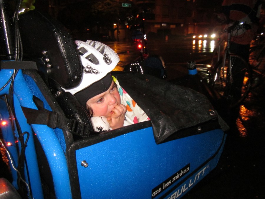 Even with our efforts to pack her in under a rain skirt, our preschooler was not enjoying this ride on the Bullitt.