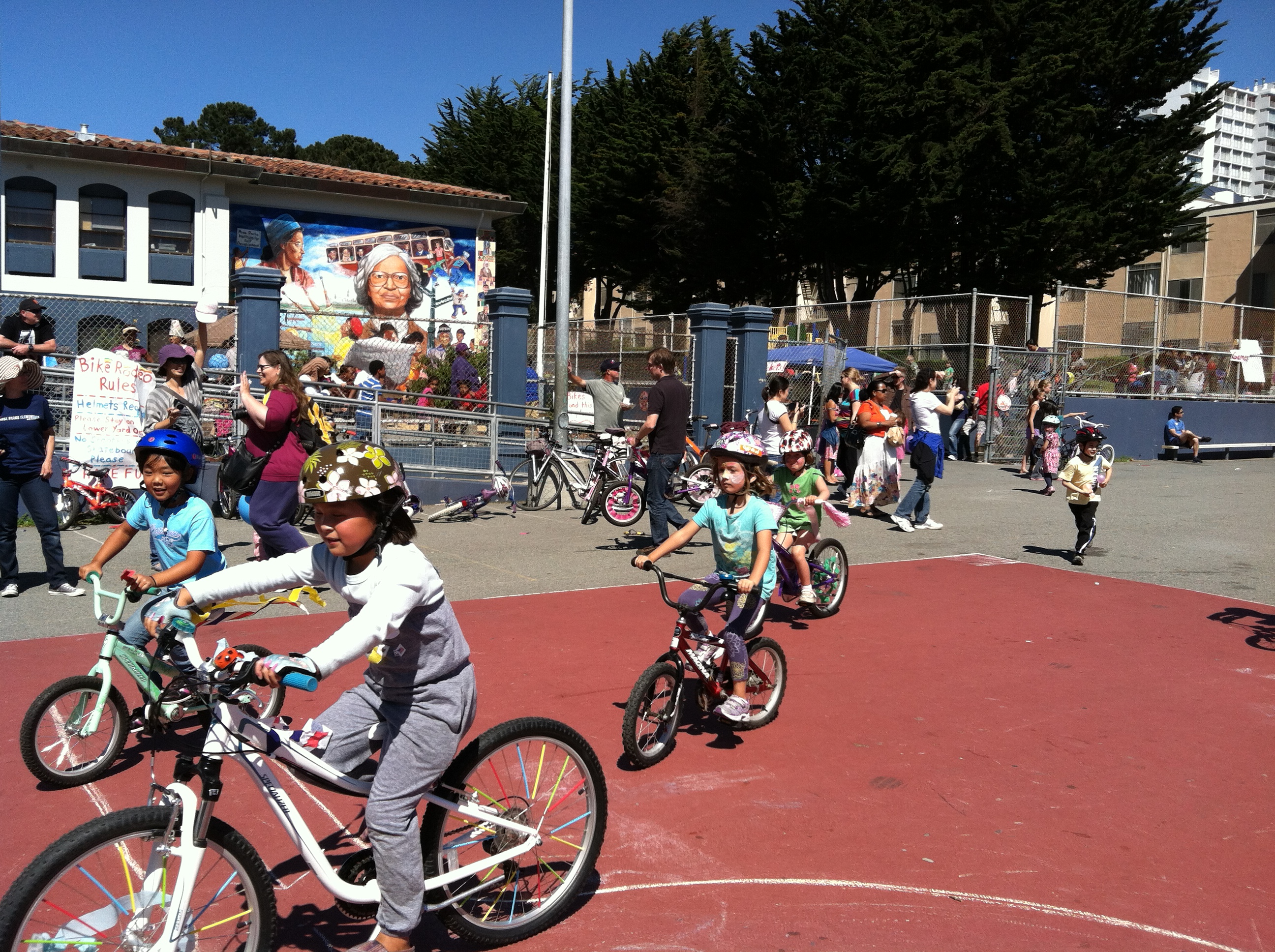 Ultimately I decided not to worry about it. I figured they’d want to ride more on their own eventually, probably when temperatures crept up in the spring, at which point we’d also have moved downhill. I find the riders who pull up next to us and shout “you should make them pedal!” beyond tiresome. Getting up to Parnassus Heights is no joke for strong and experienced riders, even with an assist, let alone little kids. How about I don’t tell you that you look stupid in lycra hotpants, and you don’t tell me how to get my kids up an 18% grade, mmmkay?