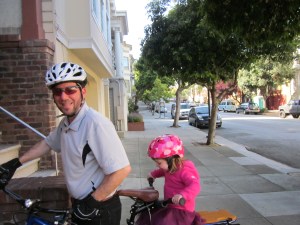 YES: There is a lot to love about this bike. Matt has no problem taking the hills with our son on the back and with cargo. Granted, for the first week he came home drenched with sweat every day even after taking the elevator (which doesn’t cover the whole hill). But it’s gotten easier; he now only rarely takes the elevator and doesn’t always need a shower, and we live at the top of a really steep hill (veloroutes says 16% if you take the direct route), a situation that has led to my classifying any city in the world other than La Paz, Bolivia, as “flat.” And as promised, the MinUte is basically the length of a normal bike—my bike is ~68” front to back and the MinUte is ~73”. It fits in the elevator (barely) and it fits in Matt’s cubicle. Matt enjoys riding it to work and finds it pretty nimble, although it’s definitely heavy. He gets a lot of envy and questions from other dads with Trail-a-bikes riding on Market Street, one of the more challenging parts of his route to the Financial District, who say that the bike+trail-a-bike is often frighteningly unstable and that hauling an extra bike length in back is limiting, especially after dropping off the kid. Based on that feedback alone we’re glad we didn’t go with that option (or for that matter, with a trailer). With the foot-pegs and stoker bars the bike looks made for two riders, but when our son’s not on board the bike looks like a heavy-duty commuter; no need to add a child seat. After our son’s drop-off Matt can use the back deck to carry more stuff, not that there’s ever been any need for that given that the bags hold a ton already. When we’re riding together even a single bag swallows everything from extra jackets and clothing to both U-locks to whatever we buy while we’re out, and he can grab things without getting off the bike; it has the capacity of a trailer without any of the hassles involved in hauling a trailer in the city. Our son can easily ride the back deck until middle school if he wants to, and his sister can ride there once he’s an independent rider.