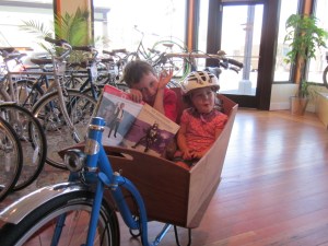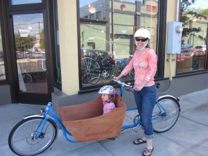 Gazelle Cabby: Clever Cycles used to stock the Gazelle Cabby, but they didn’t have one when we visited and no one else did either. The Cabby is distinctive in part because it has a fabric rather than a wooden box. The box actually folds up from the top, and with the top edges together it can be locked with stuff inside, which is pretty neat. In addition, the folding box means that the bike can be made very narrow, which makes parking it much easier. However I wonder about the durability of the fabric of the box, and like most box bikes it’s slow and supposedly hard to get up hills. It is a Dutch bike so it comes with lights, a chain guard, fenders, and a rear wheel lock. When it’s in stock Clever Cycles sells it for $2,800. Family Ride has ridden the Cabby twice (1, 2), and a couple of other families have written up their impressions as well. And in 2013, bikeMAMAdelphia weighs in again with a test ride.