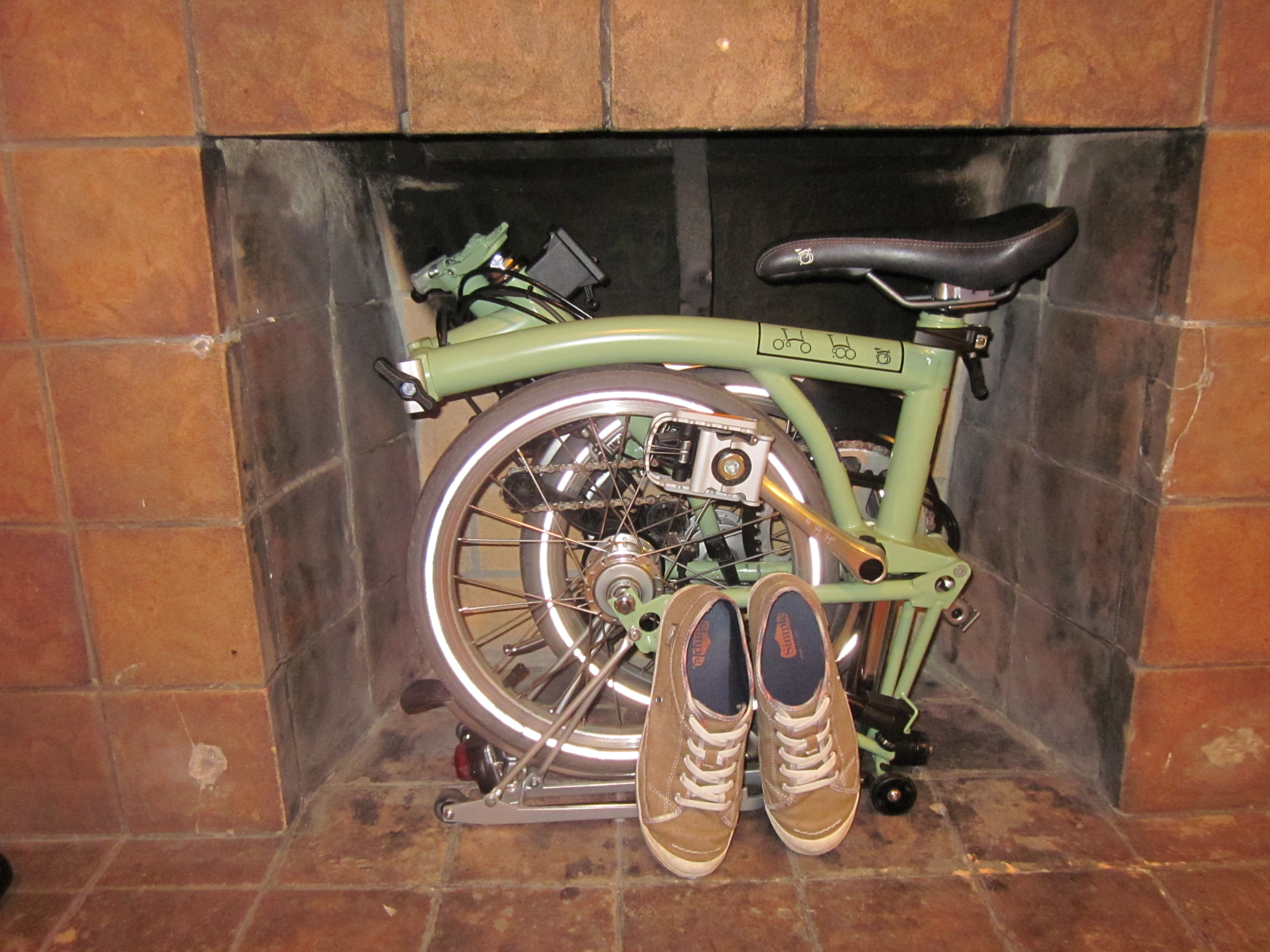 Home storage of the Brompton (with my sneakers for scale)