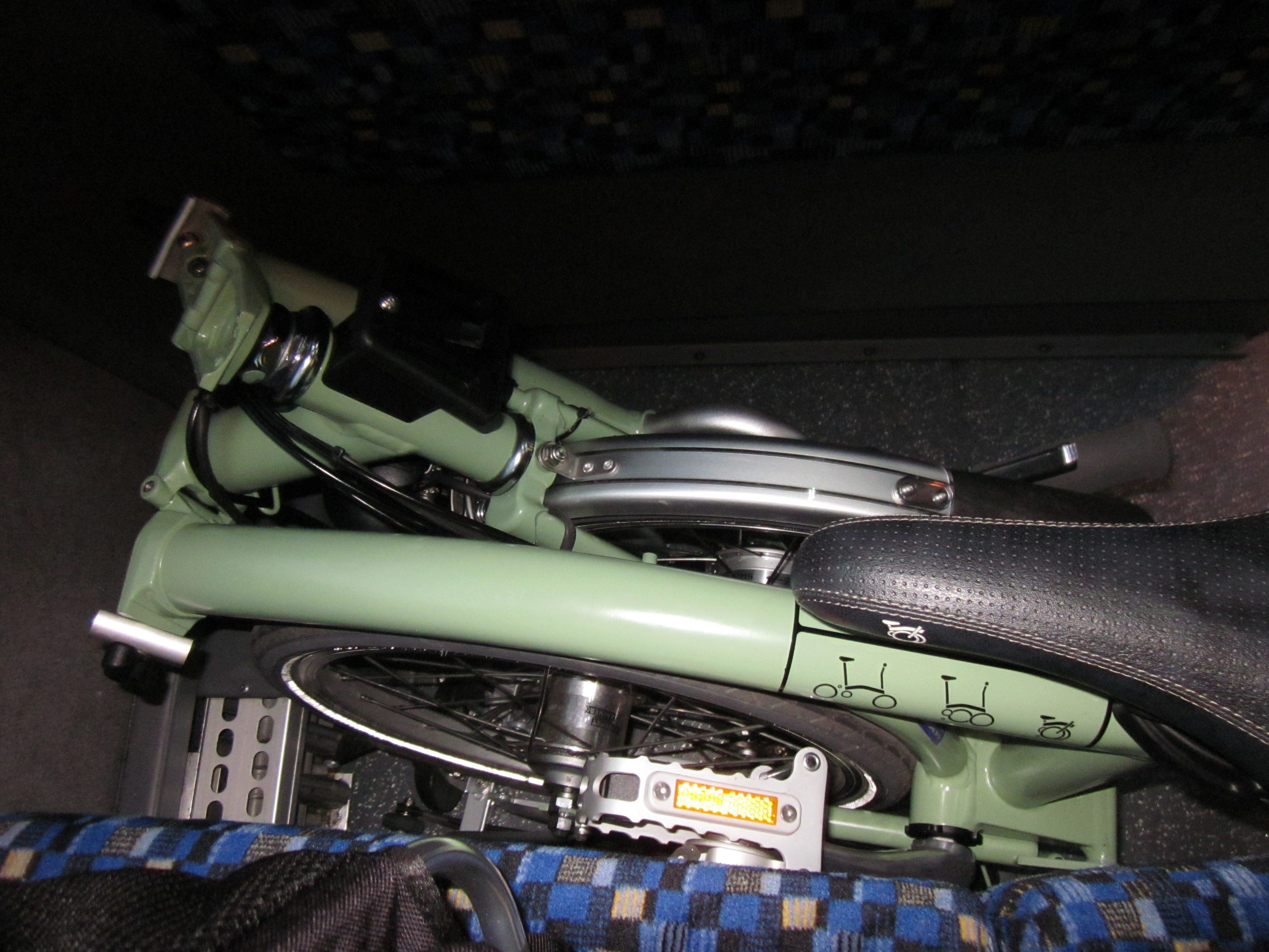 The Brompton tucked under a shuttle bus seat