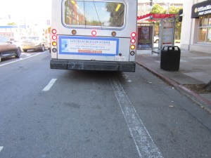 These lanes are primarily to the left of parked cars, and an opened door can easily cut the bike lane in half, giving a rider an effective width of a 2 foot (61cm) to 2.5 foot (76cm) travel lane. Dooring incidents are relatively low on weekdays as San Francisco drivers are conscious of bike commuters. Dooring incidents are rampant on weekends when out-of-towners drive into the city and leave their doors hanging open in the bike lanes for no apparent reason, maybe to air out their cars. It’s a mystery, and they get angry when we ask them, politely, to stop blocking traffic.