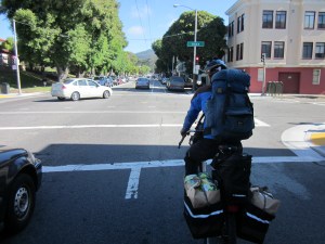 I also had real problems getting the Yuba Mundo through these pinch points when it was visiting. For a long time I couldn’t figure it out: long-tail bikes are basically the same width as other bikes and we were using the front Bread Basket for cargo, so we didn’t have the MinUte rear bag problem. Why was I feeling caught at intersections all of the time and forced to stop behind turning cars (blocking other bikes behind me)? I hated taking the lane from the bike lane when the kids were on deck; cargo bikes are slow to start when laden, and drivers understandably get a little annoyed when riders swing in and out of the bike lanes. And I was the only bike doing it.